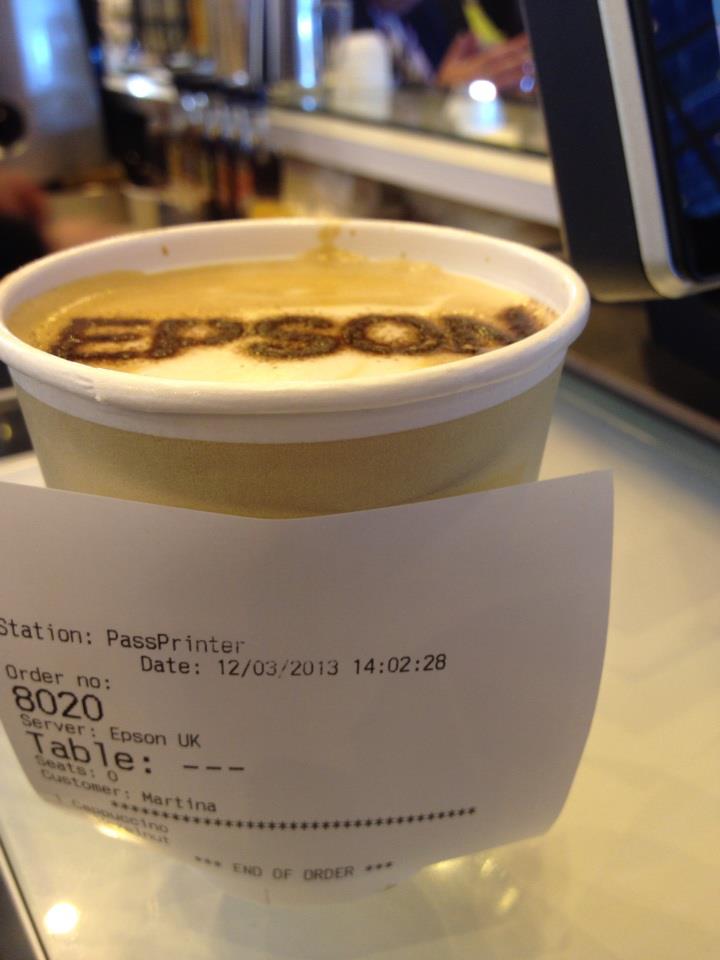 Moving onto the consumer point of view, Adrian Clark, Epson’s Head of Sales for Business Systems took me to the coffee bar, where via a mobile device I entered my name and chose a cappuccino. I was close enough to see how the ticket and receipt was printed before it was attached to my cappuccino complete with my name!